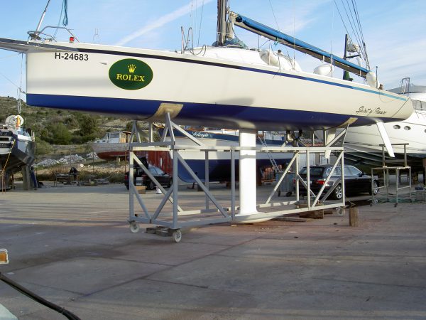 Árboc: 20m, karbon, rod vantnik, karbon profil forstay, King Rope – soft backstay, mast jack – Holmatro