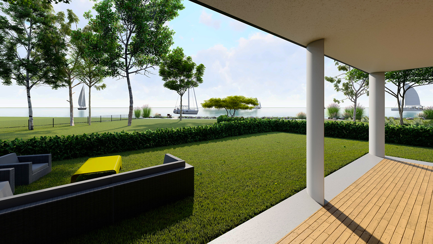 A nyaralóközpont nagyszerűsége épp az egyszerűségében rejlik, amely megmutatkozik a letisztult formatervezésben, az anyaghasználatban, a szabad terek, közlekedők és jól elszeparálható tágas, privát kertek és teraszok kialakításában is. A hosszú, ám keskeny, zárt és őrzött, parkolóval rendelkező területen saját stég és lakásokhoz tartozó napozóágyak is a zavartalan nyugalmat szolgálják.