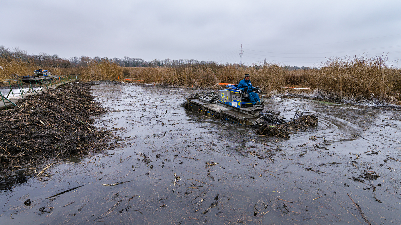 Három nádvágó adapterrel felszerelt kétéltű eszköz, két gumihevederes kiskotró, valamint egy széles lánctalpú kisebb és egy nagy kotró.