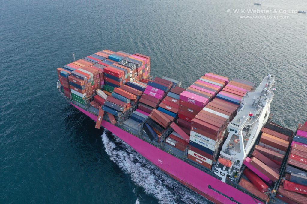 „Jól látható, hogy a fedélzetre rakott sorok többsége összeomlott a hajó jobb és bal oldalán egyaránt. Mindössze 6 maradt sértetlen vagy részben sértetlen. Abból kiindulva, hogy a rakodáskor a sorokban 6, illetve 8 konténert rakodtak egymásra a becslésünk szerint körülbelül 2 250 negyvenlábas konténer veszett el vagy sérült meg. Ez pedig azt jelenti, hogy több, mint a rakomány egyharmada veszhetett oda.”