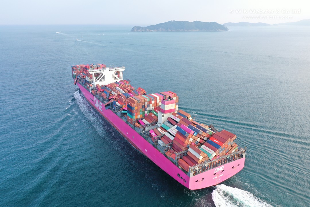 A ONE Apus konténerszállító Kalifornia felé hajózott a Csendes-óceánon, amikor november 30-án a viharos időben a rakomány megmozdult. A tulajdonosok és menedzsereik szerint 1 816 darab konténer veszett el. A hajó megérkezett a japán Kobe kikötőjébe, ekkor készültek az itt látható felvételek. A sérült, de fedélzeten maradt konténerek számbavétele után lehet majd pontos számokat tudni, de a szakértők a felvételek alapján úgy vélik, hogy a közölt számnál több konténer került az óceánba.