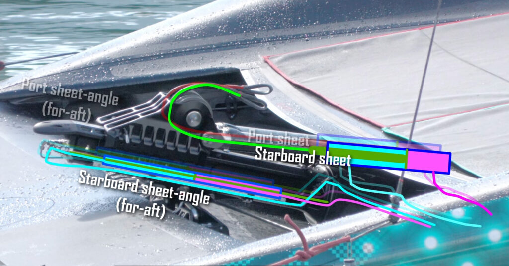 Ám az Emirates Team New Zealand egy alig látható technikai előnnyel is bír. Ez pedig a nagyvitorla hátulját mozgató rendszer, a sínen mozgó lékocsi, és a kétrétegű vitorla hátsó éleit állító kötélzet. Ez menet közben burkolat alatt dolgozva alig látszik.