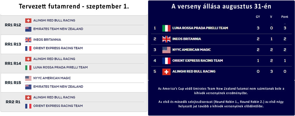 Az is egyre világosabban látszik, hogy jelenleg az Alinghi Red Bull Racing csapata az, amelyik teljesítmény potenciálját tekintve – az előversenyen is látottakkal együtt – lefelé kilóg a mezőnyből. Akár a hajó, akár a csapat produkcióját nézve, bár ez utóbbinak az értékelésekor nagyon fontos tudni, hogy lassabb, vagy a szárnyalásból, a foilerezésből könnyebben kieső hajóval senki sem lehet ügyes és okos. Sőt! A sebességhátrány – ahogy jönnek a pofonok egyre hatványozottabban – oka a hajókezelési és versenytaktikai hibák szaporodásának. Bár a kieső hely elkerüléséért nagy küzdelem várható, jelenleg a svájciak erre a leginkább „esélyesek”.