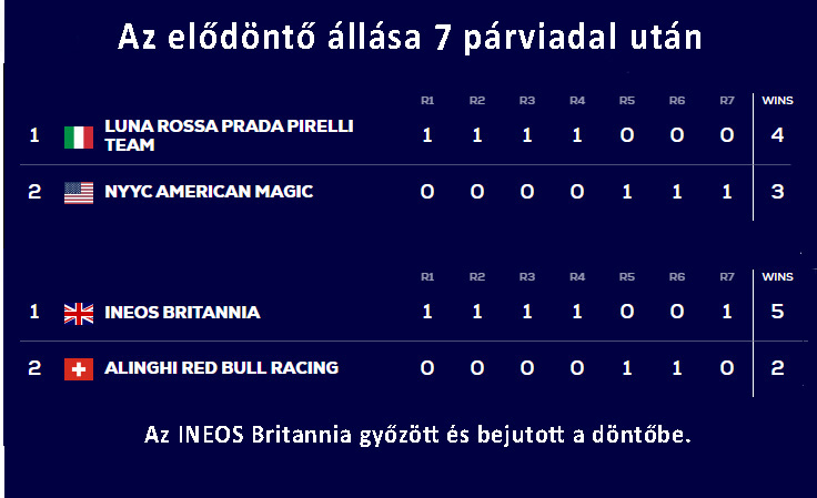 Barcelona vízein szeptember 18-án, szerdán lezárult az egyik Louis Vuitton Kupa elődöntős párviadal. Előbb az Alinghi szerezte meg a második győzelmét, ám a következő futamon az INEOS Britannia fölényesen diadalmaskodott, és így 5-2-es eredménnyel legyőzte a svájci Alinghi Red Bull Racinget, és ezzel bejutott a kihívók versenyének döntőjébe.