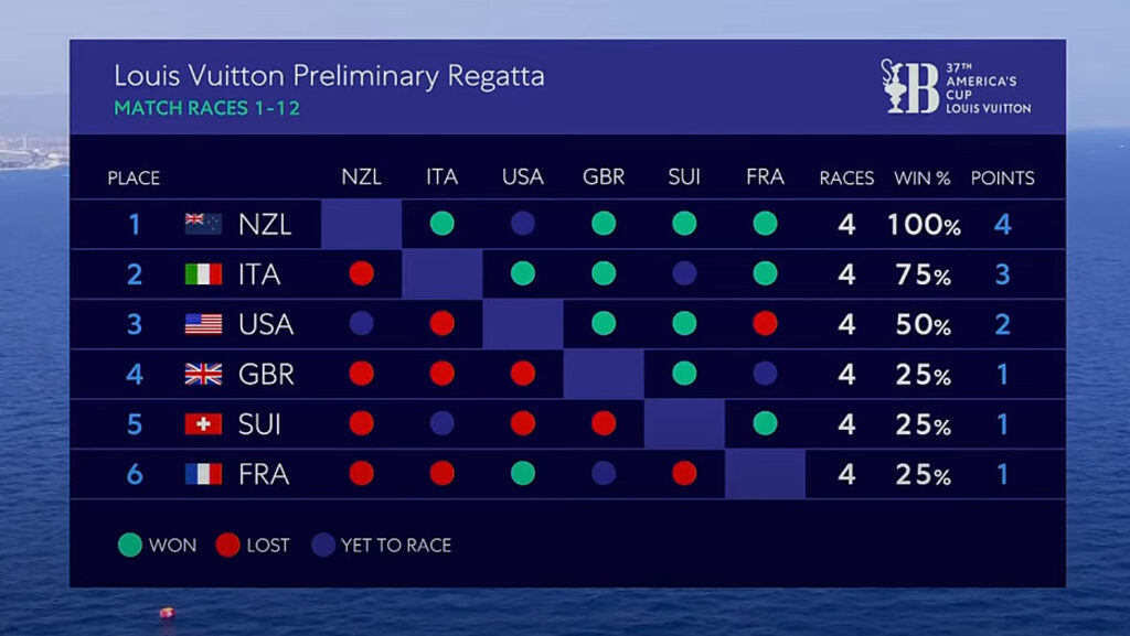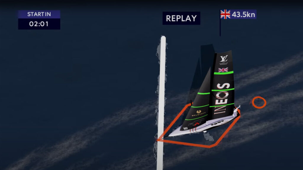 A másodikként, jobbcsapáson a rajtterületre érkező INEOS Britannia néhány centivel, a lent látható képpel igazoltan túl korán ért a rajtterületre. Az orrsudár belógott. Ők 2 perccel az indulás előtt vitorlázhattak volna be a rajtterületre. Ilyenkor a jobbcsapáson érkező hajó nagyon igyekszik, hogy az útjogát kihasználva támadhassa az ellenfelet, és a rajt előtti párviadalban előnyösebb helyzetbe kerüljön. A britek 40 csomó feletti sebességgel érkezve ezredmásodpercnyit hibáztak, ám így büntetéssel kellett kezdeniük a futamot. Jobban rajtolva biztos szél alatti helyzetbe kerülhettek volna, pár másodpercig láthatóan meg is indultak az olaszok alatt, ám ezután le kellett ejteniük, hogy teljesítsék a büntetést, és legalább 75 méterrel az ellenfél mögé kerüljenek. Ezzel a futam el is dőlt.