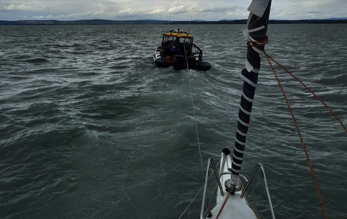 Hiszen addigra, semmi idő alatt megérkezett a mentőhajó és vontára fogott minket. Sanyitól kaptunk egy fékezőhorgonyt. Azt hátrakötöttük, így segítette egyenesben tartani a hajónkat és már mehetett is a vonta Kenesére vissza.