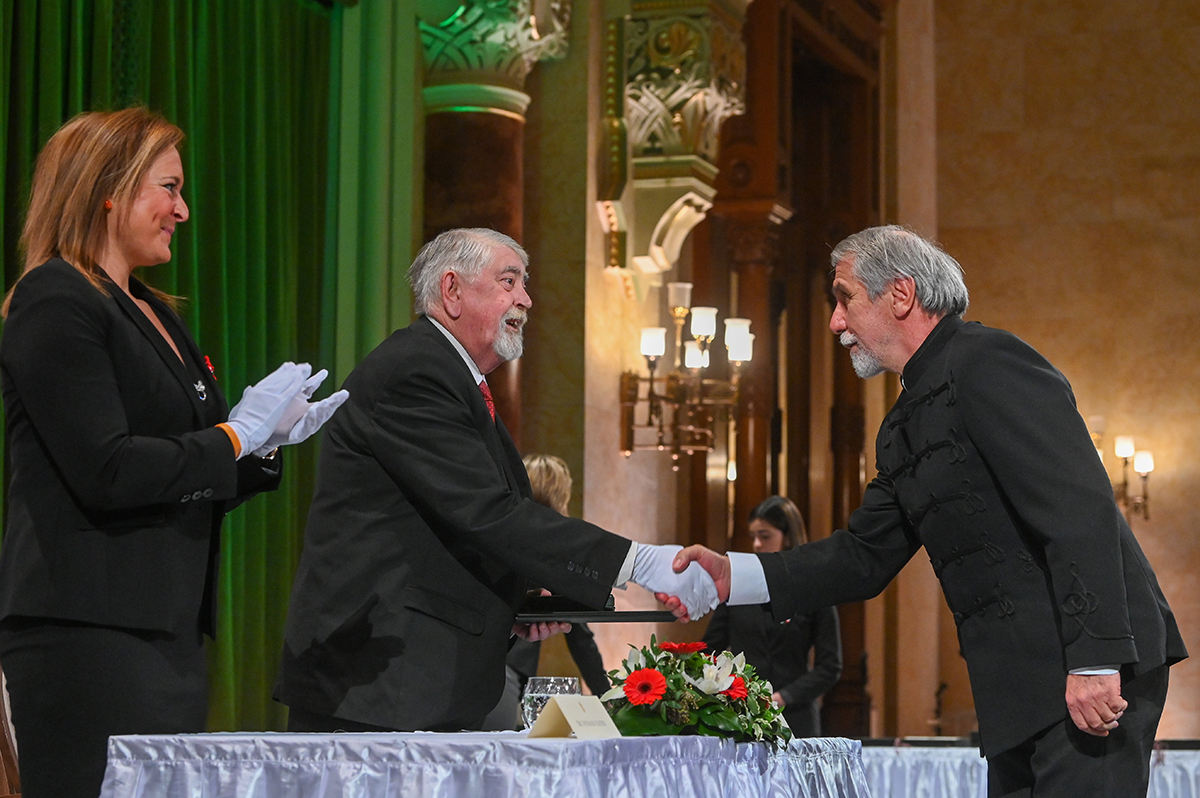 Detre Zsolt Álmos olimpiai bronzérmes, Európa-bajnoki kétszeres arany, ezüst és bronzérmes, harminckétszeres magyar bajnok vitorlázó (j) átveszi a március 15-e alkalmából odaítélt a Magyar Érdemrend Lovagkereszt polgári tagozat kitüntetést Kásler Miklóstól, az emberi erőforrások miniszterétől a Pesti Vigadóban 2022. március 11-én. MTI/Illyés Tibor