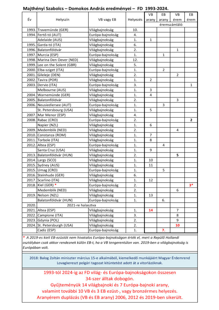 1993-tól 2024-ig az FD világ- és Európa-bajnokságokon összesen 34-szer álltak dobogón. Gyűjteményük 14 világbajnoki és 7 Európa-bajnoki arany, valamint további 10 VB és 4 EB érmes helyezés. (Összesen 34 VB-EB érem) Aranyérem duplázás (VB és EB arany) 2006, 2012 és 2019-ben sikerült. Ráadásul az EB érmeik száma akár több is lehetne, de a Repülő Hollandi osztályban csak abban az évben rendeznek Európa-bajnokságot, ha a világbajnokságra tengerentúlon kerül sor. Legutóbb 2019-ben volt EB, akkor Balatonföldváron.