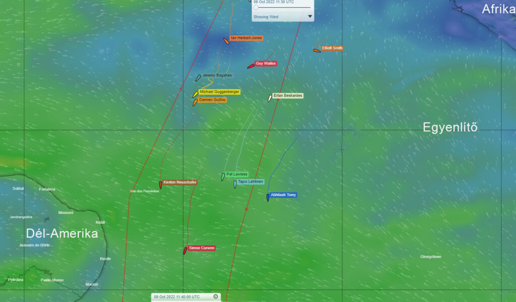 A Golden Globe Race 2022 verseny állása 2022 október 9-én. Öten túl vannak az Egyenlítőn