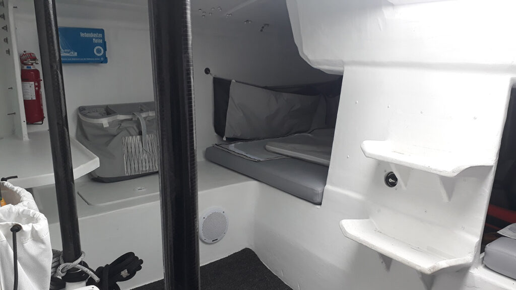 Van hozzá egy kompakt egységben beszerelhető hűtő és mobil konyha, ami például pályaversenyzéskor könnyen kiszerelhető. Viszont komfortos, amikor kedvtelésből vitorláznak a hajóval. Sokfelé szereltünk fel ötletes tárolózsákokat, és ezen a téren bőven vannak még lehetőségek. Szépen szegett szőnyegekkel is igyekszünk a hajót család és feleségkompatibilissá tenni…