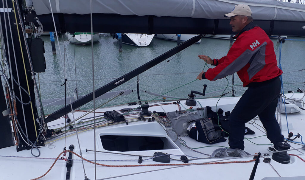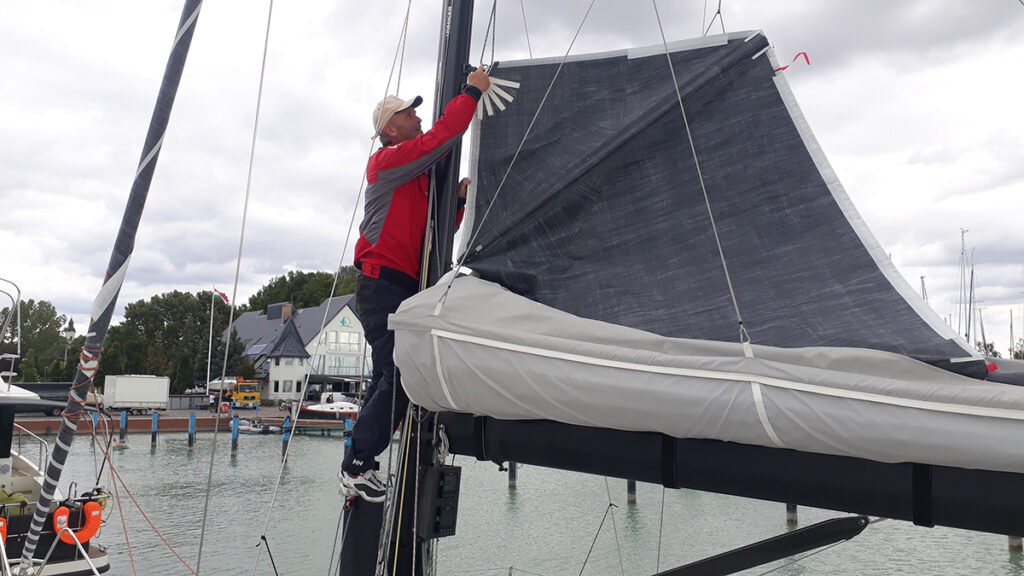 Hál’Istennek a tavaszi összeszereléshez képest nem kellett veretet visszaszedni, a hajón hardverben módosítás gyakorlatilag nem történt. Justin megtervezte, vázlatosan megadta a felszereléseket, hogy miből mekkorát és mennyit, hogyan legyenek elvezetve a kötelek, azt mind megadta. Az elhelyezésben adott némi szabad kezet, amire az aszimmetrikusan elhelyezett kajütlejáró miatt volt is min gondolkodni. Igyekeztük úgy megcsinálni, hogy a hajó kislétszámú csapattal is jól működtethető legyen. Az áttételek jól összeálltak, kicsit kellett még a grósz finombehúzón dolgozni.