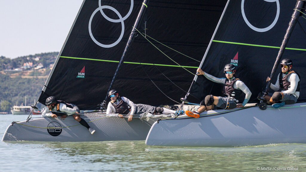 Balra A KÜRT – Team Kaáli (Virág Flóra), középen a Raifeissen Fifty-Fifty (Józsa Márton), háttérben a Process Solutions (Litkey Farkas), jobbra pedig a Prospex, amely már AUDAX Django és Petrányi Zoltán csapata vitorlázza – Fotó:: Cserta Gábor