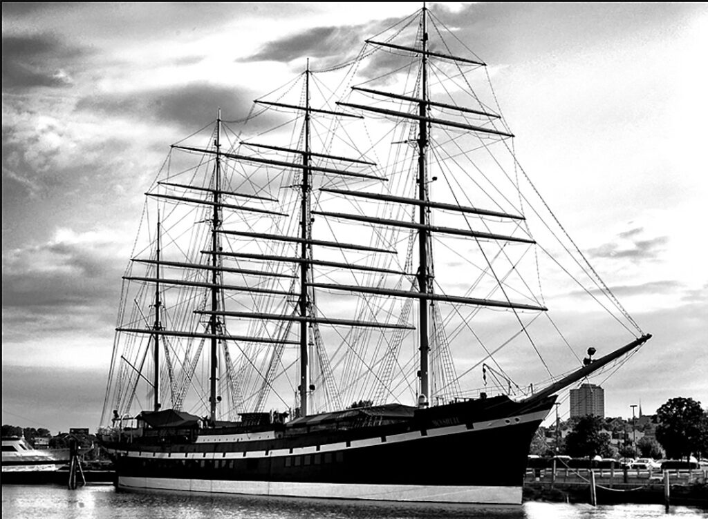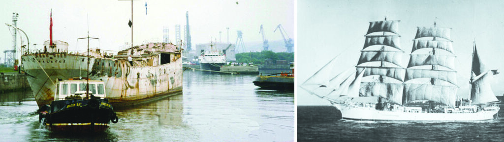 A háromárbócos 1992-ben roncsként és fénykorában vitorlák alatt