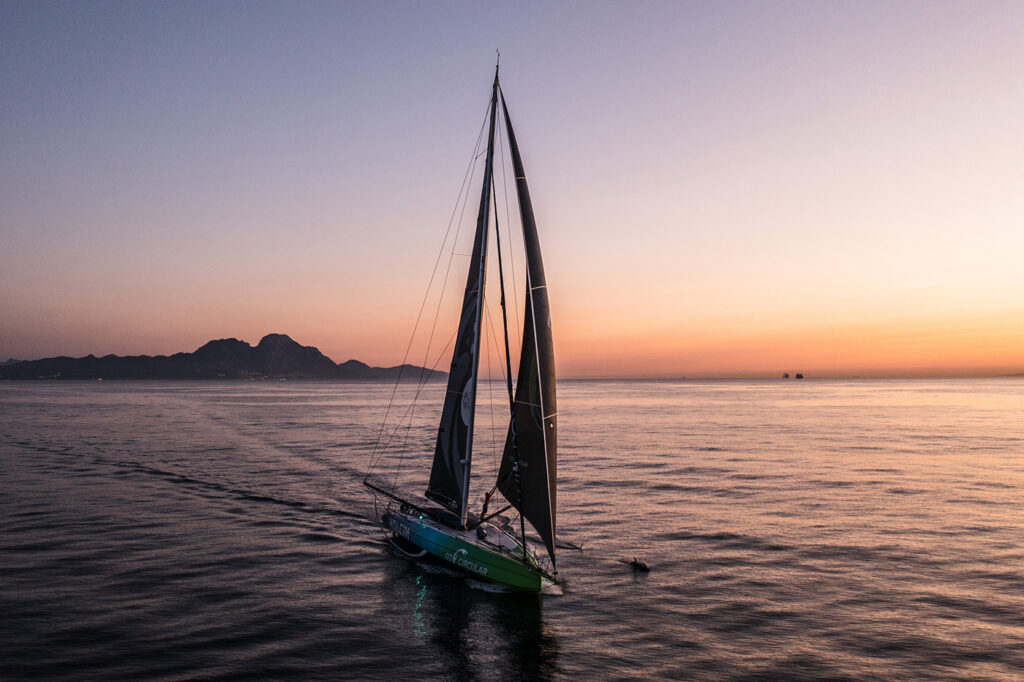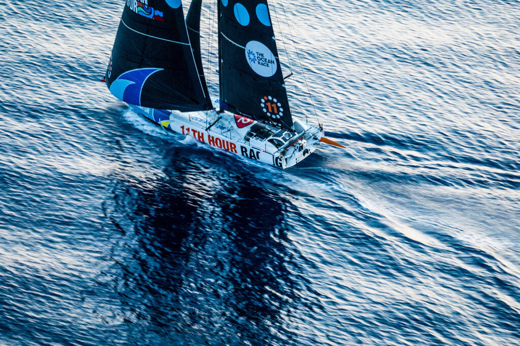 Az 11th Hour Racing befoltozott testtel versenyen kívül vitorlázik a többiekk után Genovába, hogy részt vegyen a záró kikötői futamon – Fotó: Amory Ross