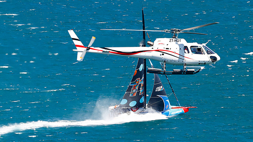 Az 11th Hour Racing Team huszoncsomós tempóban és egy közvetítő helikopter – Fotó: Sailing Energy / Ocean Race