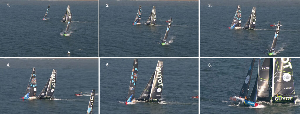 A négyszög alakú pálya egyik szakaszán 12 csomós szélben cirkálniuk kellett a hajóknak. Az élen a Holcim-PRB jobbcsapáson már a bóját közelítette, amikor mögötte, lemaradva balcsapáson elvitorlázott az 11th Hour Racing és a Guyot. E két hajó közül előbb a Charlie Enright vezette 11th Hour fordult, bőven a bójavonal felett jobbcsapásra. A Guyot, amelyen Benjamin Dutreux kormányzott balcsapáson vitorlázva tartott feléjük. Már túlértek a bójavonalon (a fordulás esetén a bója felé vezető útvonalon, amely tisztán látszott a Holcim menetéből), de nem fordultak (1.kép).