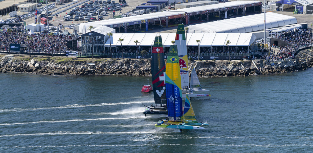 Olykor szinte célfotó kellett egy-egy szoros célbafutásnál – Fotó: Photo: Ricardo Pinto / SailGPA szombati négy futam után Burlingék vezettek.
