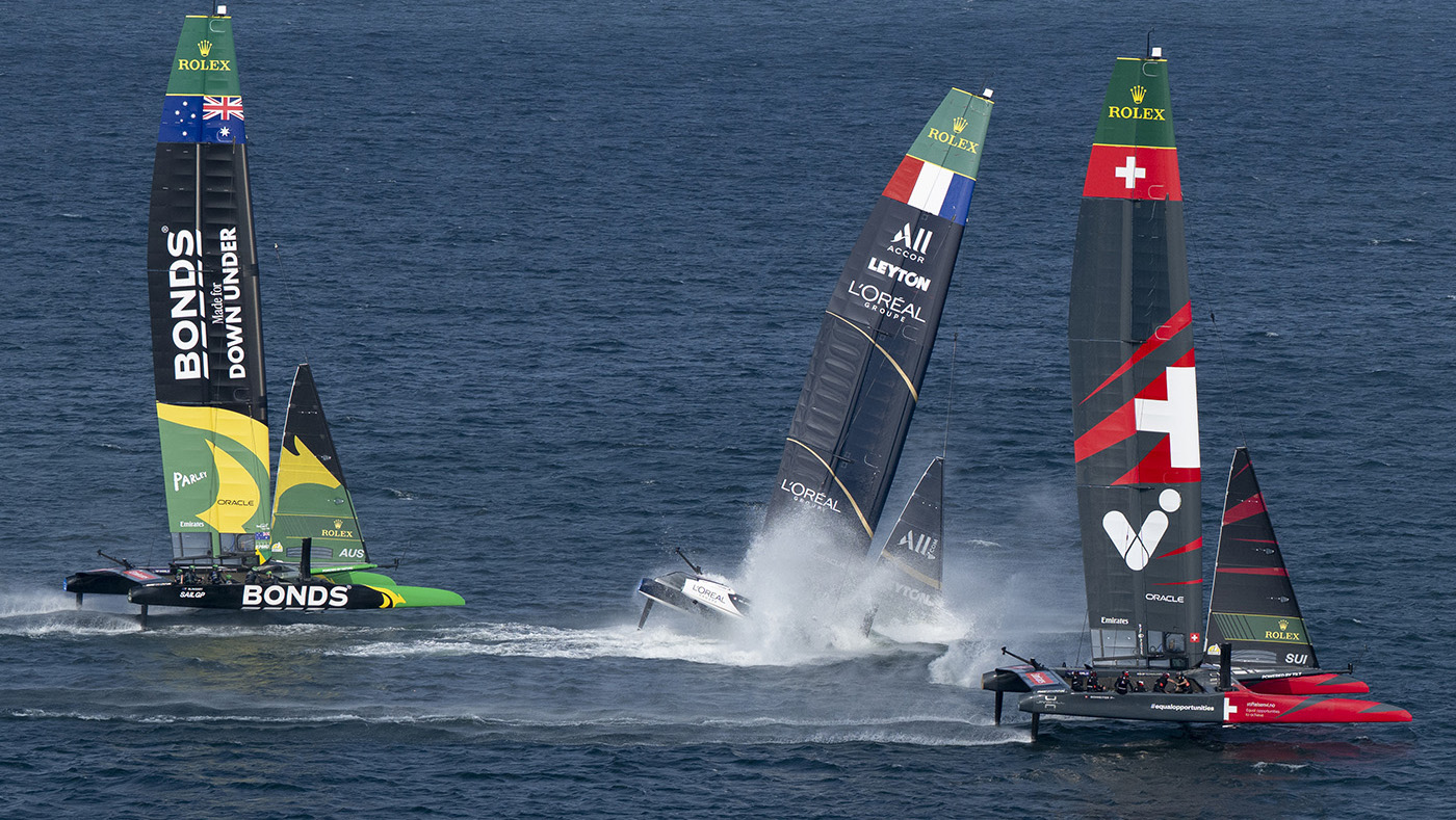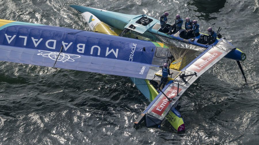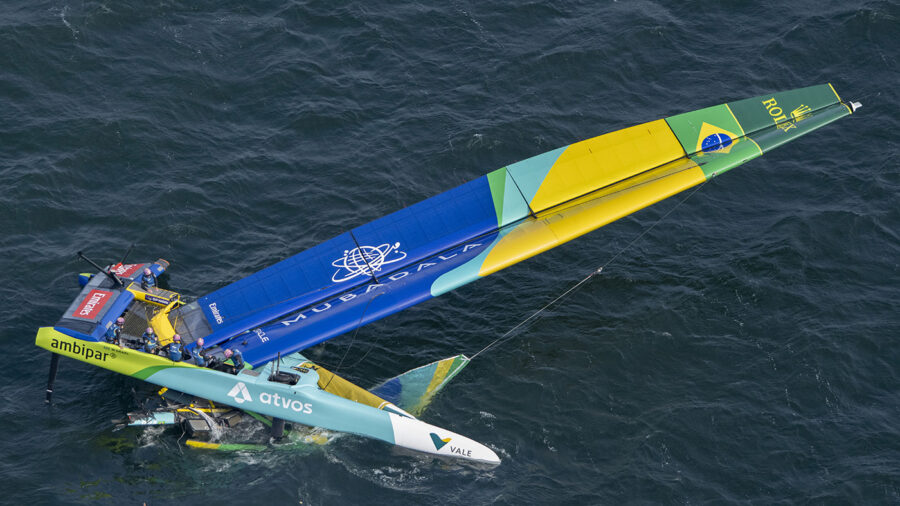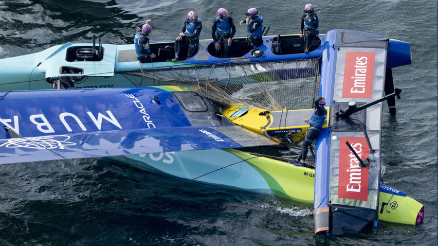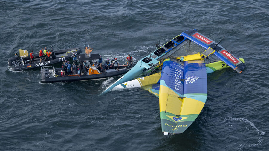 A franciák haváriájának első pillanta. A videókon jól látható az elrepülő kormánylap. A kép bal sarkában pedig az akkor még ép brazil hajó. – Fotó: Jonathan Nackstrand for SailGP