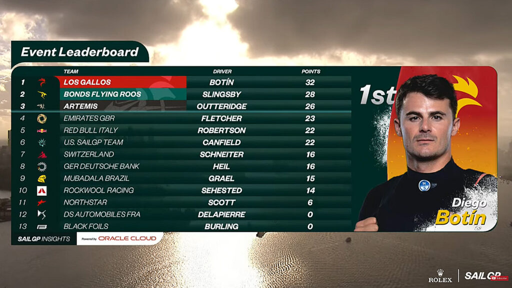 Az első és az utolsó futamot a hazai csapat a Bonds Flying Roos nyerte Tom Slingsby vezetésével, ám két gyengébb menetük után, amelyben volt például korai rajt is, nem ők vezetik a listát, hanem a szintén kétszer futamgyőztes spanyolok. A Los Gallos a két középső futamon diadalmaskodott.
