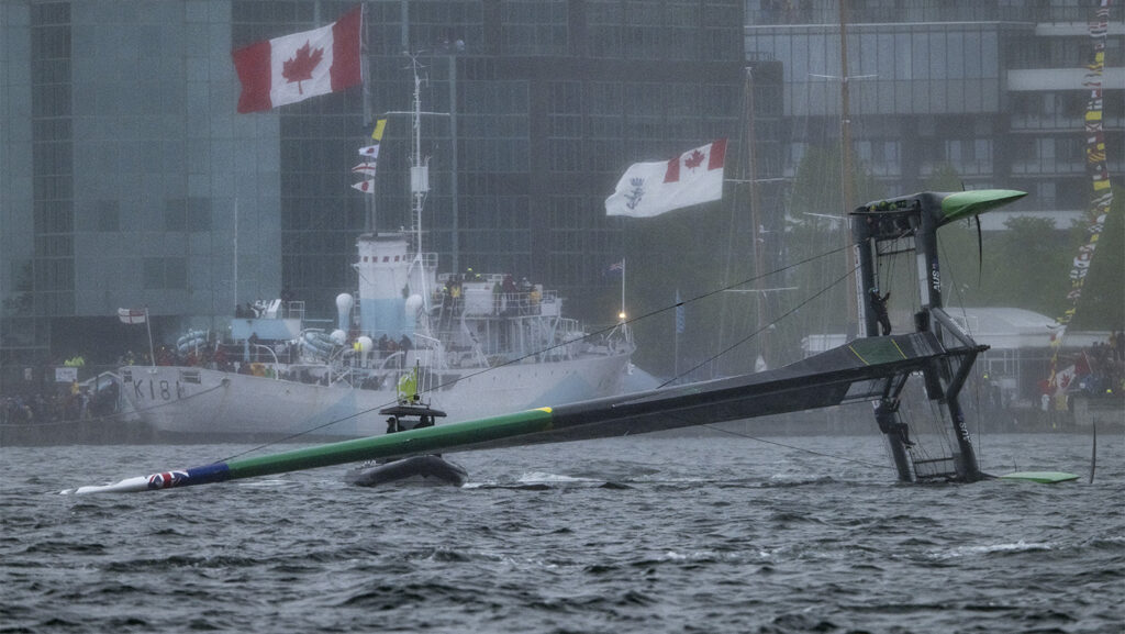 Az egyik ilyen hozta az első eseményt: az első krajc végén a második helyen vitorlázó ausztrálok a kanadaiak elé-alá akartak fordulni, ám abból majdnem borulás lett. Tom Slingsby a futam után azt mondta, hogy a merevszárny nem váltott át, inverz, szél felé ívelő profil maradt. Akkor – még – a wing-trimmer a grószsott engedésével éppen hogy segíteni tudott a válsághelyzeten, és a zöldorrú ausztrál hajó a boruláshatártól visszazuttyant a talpára. Ám a megállás miatt négy helyet visszaestek.