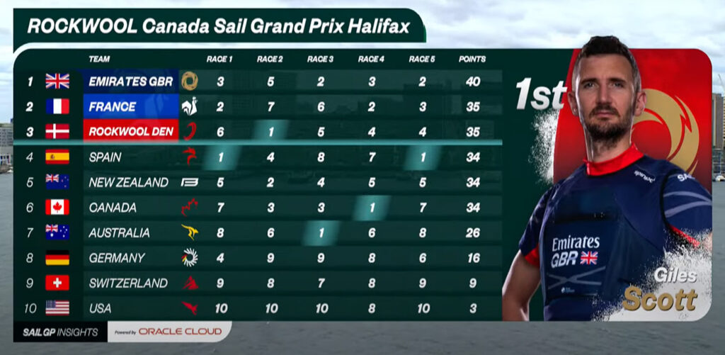 Az Emirates Team GBR megérdemelten győzött. Egyenletes teljesítményüknek köszönhető, hogy a legeredményesebbek voltak, ami nagyon nagy szó a halifaxi zavaros szelekben. Ők minden futamon odaértek a mezőny első felébe. Még nagyobb jelentőségű, hogy Giles Scott megérett a feladatra. Nem lehet könnyű Ben Ainslie helyére ülni, még ha kétszeres olimpiai bajnok és sokszoros világbajnok is az ember. Sir Ben januárban szállt ki a SailGP-ből,. Azóta Scott 7. és 8. helyeket ért el ugyanazzal a csapattal és hajóval. De most olyan volt a brit F50-es, mintha Ben Ainslie vezette volna, mégpedig a legjobb napjain. Mert betlizni ő is, a legnagyobb versenyzők is tudnak.