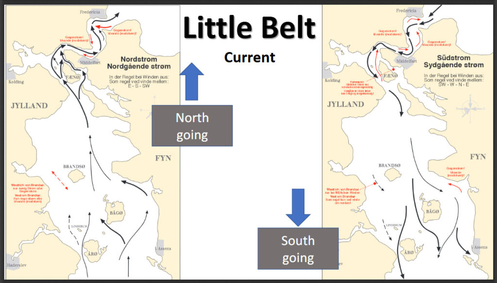 - Először is a tengeráramlatok. Nyílt helyen nem kell annyira foglalkozni velük, de pl. a Little Beltnél (Fyn északnyugati részén egy szűk, kanyargós csatorna) teljesen átrendezheti a mezőnyt. Ha szerencséd van, akkor visz az áramlat, vagy legalábbis nincs semmilyen komoly áramlás. Ha viszont olyankor érsz oda, amikor elindul a szembe áramlás, és ezt még megfejeli egy gyenge – esetleg kedvezőtlen irányú – szél, nos, akkor ott semmi értelme küzdeni. Lehet, hogy órákig krajcolsz, de csak visszafelé haladsz. A legtöbben ilyenkor horgonyt dobnak, és megvárják, míg elül az erős szembe áramlás. Ez volt a helyzet 2020-ban is, amikor rengetegen összegyűltünk, és itt sokan fel is adták.