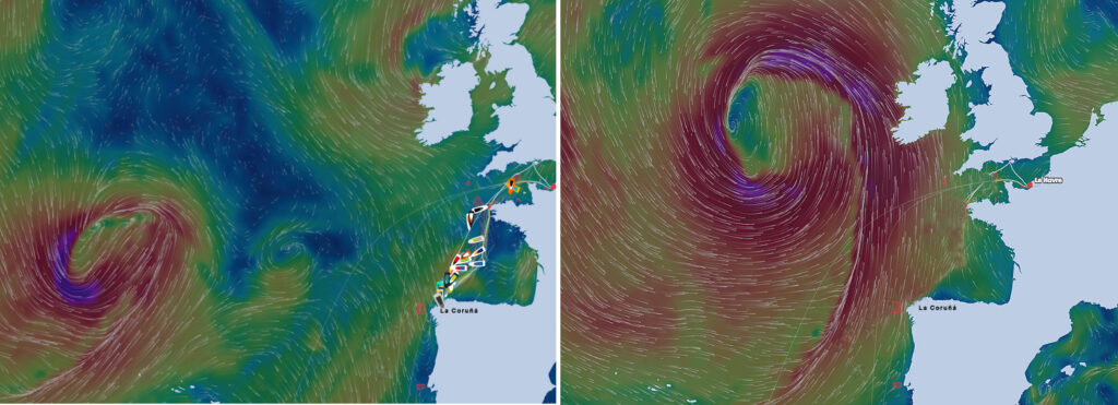 Balra: Az időjárási helyzet és a Class 40 mezőny október 29-én reggel – Jobbra: a várható szélhelyzet október 30-án