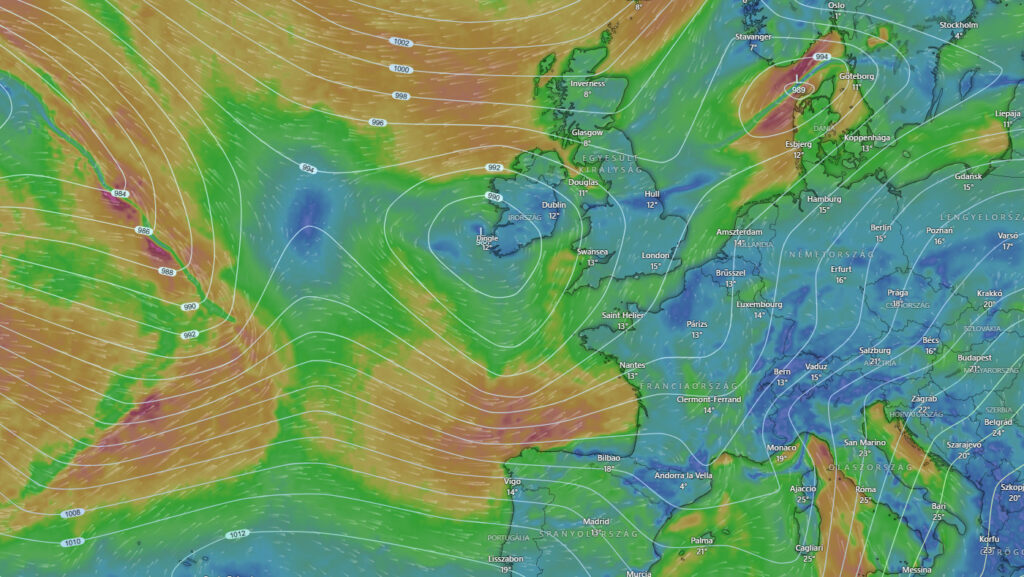 A felső képen a szélhelyzet jelenleg, alul pedig a november 3-án hajnali várható helyzet. A sötétlila foltokban a szél 60 csomó feletti erővel fújhat majd