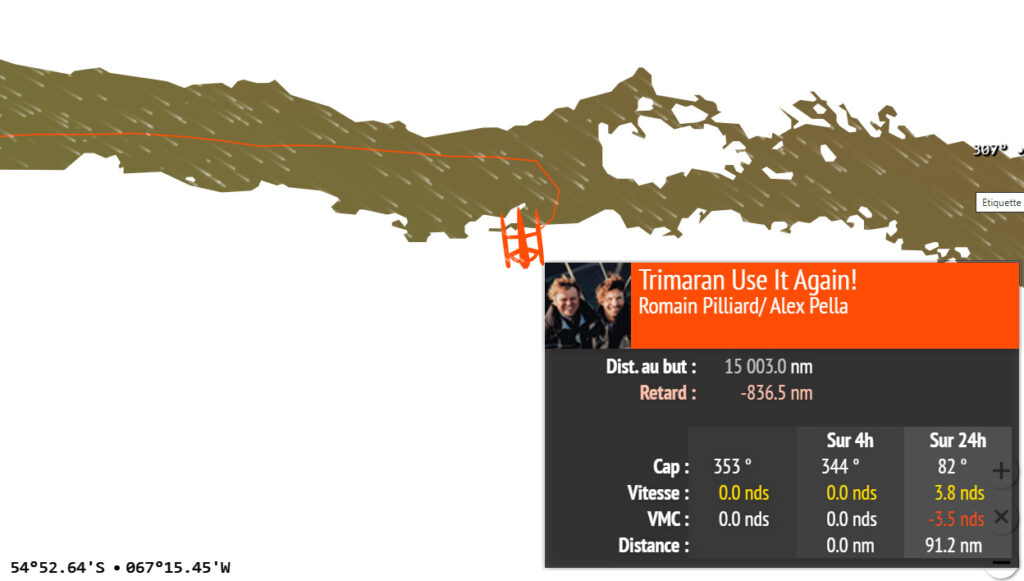 Rekordkísérletük 35. napján, négy nappal a Horn-fok kerülésük után, Patagónia partjainál a viharos szelek elől a Beagle-csatornába a szigetek mögé húzódó Use it Again zátonyra futott, így Romain Pilliard és Alex Pella útja véget ért. Napok óta egy érkező 30-40-50 csomós szeleket hozó alcsonnyomású időjárási rendszer elől próbáltak selterezni a szigetek között. Azt kivárni, hogy időjárási kapu nyíljon nekik a Csendes-óceánon a haladáshoz.