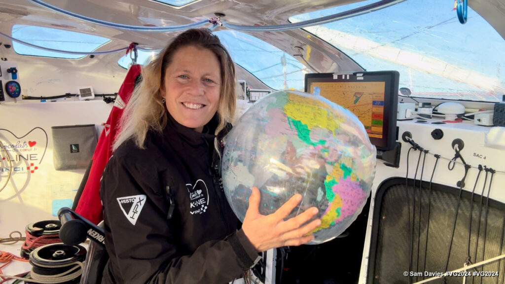 Sokatmondó kép a negyedik Vendée Globe-ját teljesítő Samantha Davies-ről, amint egy felfújt földgömb-strandlabdán mutatja meg, hogy hol jár. Hogy illusztráljam a sztereotip gondolkodás szépségeit, úgy vélem ilyen nincs egyik férfi versenyzőnél sem… Vagyis nehezen képzelem el, ahogy Jeremie Beyou a homlokát ráncolja bepakoláskor a kikötőben a földkerülésre készülődve, majd a homlokára csap, el ne felejtsem a felfújható földgömbömet, majd megmutatni a gyerekeknek a Némó pontnál, hogy az hol van…